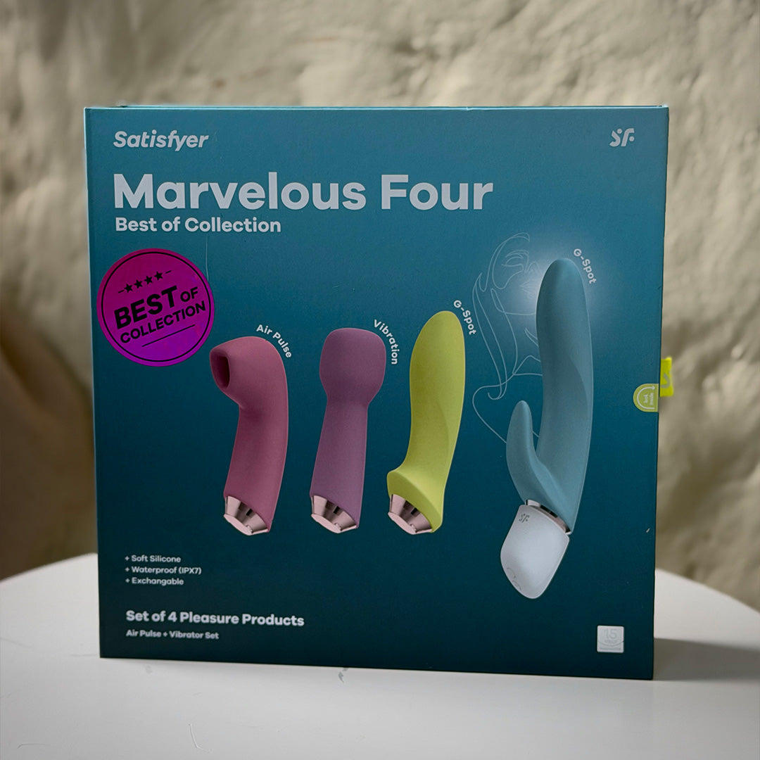 Marvelous Four – це набір, який дарує повний контроль над твоїми фантазіями. У коробці — ціла колекція з чотирьох найпопулярніших іграшок від Satisfyer, об’єднаних одним блоком управління. Просто обери насадку, закріпи її одним рухом і насолоджуйся.