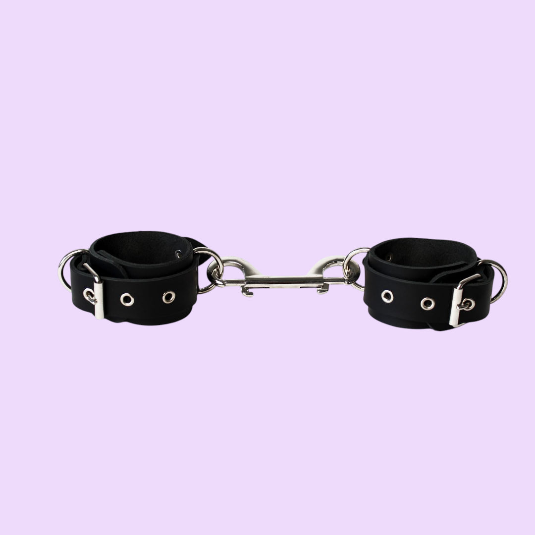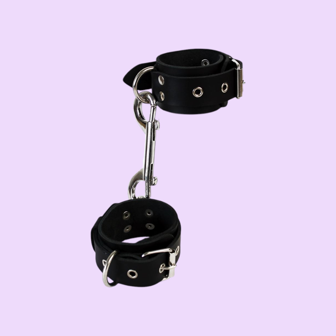 М’яка натуральна шкіра м’яко огортає зап’ястя, не залишаючи слідів і не створюючи дискомфорту, а міцна металева фурнітура надає надійності та безпеки під час гри. Завдяки карабіну наручники легко з’єднуються або від’єднуються — контроль у ваших руках 🖤